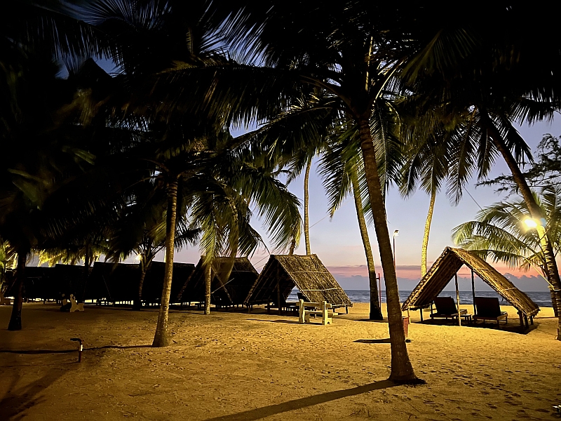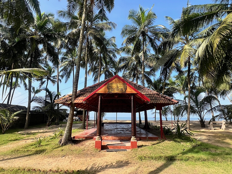 Das Nattika würde man nicht finden – ohne Fahrer keine Chance. Durch unzählige kleinere und grössere Dörfchen und Städte dauert die Fahrt vom Flughafen Cochin je nach Verkehr ca. 1 h 45 min. Plötzlich öffnet sich ein Tor, die ansehnliche Einfahrt und ein grosser, offener Eingangsbereich tun sich auf. Durch einen liebevoll angelegten und täglich gepflegten Garten mit Rasen, Palmen und blühenden Büschen wird man zu seinem Bungalow begleitet. Alles ist neu und doch vertraut – für Gäste die das Coconut Bay kennen. Die Häuschen der gehobenen Kategorie scheinen den gleichen Grundriss zu haben, sind grosszügig und hell. Fensterreihen an drei Gebäudeseiten. Im Inneren sind sie aber individuell geschnitten. Sonnenliegen, bei Bedarf ein Schirm und Tischchen auf der eigenen Eingangsterrasse. Der Abstand zwischen den Häuschen ist grosszügig. Der Pool liegt in Sichtweite mit Blick auf das Meer. Der Strand ist breit, einsam und so lang, dass man in keiner Richtung dessen Ende sehen kann. Palmblatt-Hütten schützen vor der Sonne und bieten Platz für 2 Sonnenliegen. Das Wasser hat Badewannentemperatur, die Brandung hält sich in Grenzen. Der beständige Wind vom Meer wird durch ein dem Garten vorgelagertes, lichtes Wäldchen gebremst.